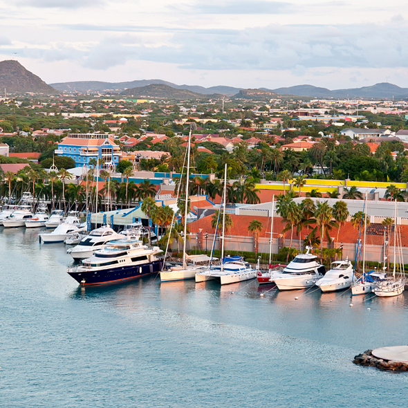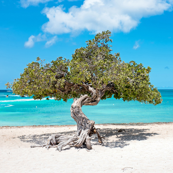 Located 15 miles north of Venezuela in the warm waters of the southern Caribbean, Aruba is home to beautiful white-sand beaches, 82-degree days, and some of the warmest people in the world. Our island is 19.6 miles long and 6 miles across, with a total area of 70 square miles. We're located just below the hurricane belt, and unlike many islands in the Caribbean, our climate is dry, so we rarely have a rainy day. On the south and west coasts of Aruba, you'll find Oranjestad, our capital city, and miles of beaches that have been named some of the best in the world. Here, you'll find most of the hotels and all-inclusive resorts in Aruba, and Queen Beatrix International Airport (AUA). In the interior of the island, you'll find Arikok National Park, a desert like preserve with a variety of wildlife, cacti and dramatic rock formations. You'll also find some of Aruba's most striking views, as the ocean crashes against the rugged shoreline below. On the northeast coast, along the windward shore, you'll see our island's unofficial mascots, the fofoti trees. The constant trade winds have permanently sculpted them into graceful, southwesterly bending forms.